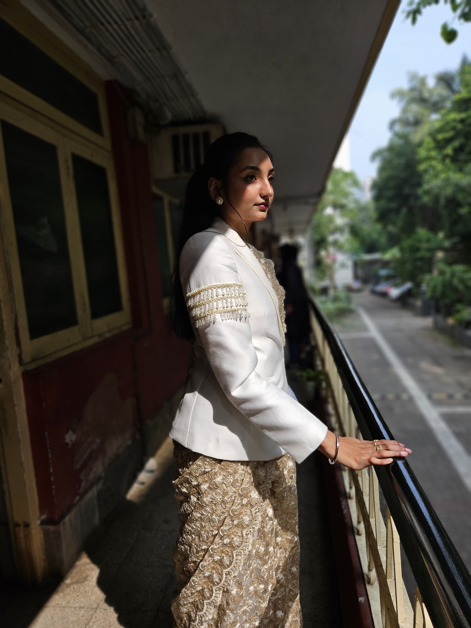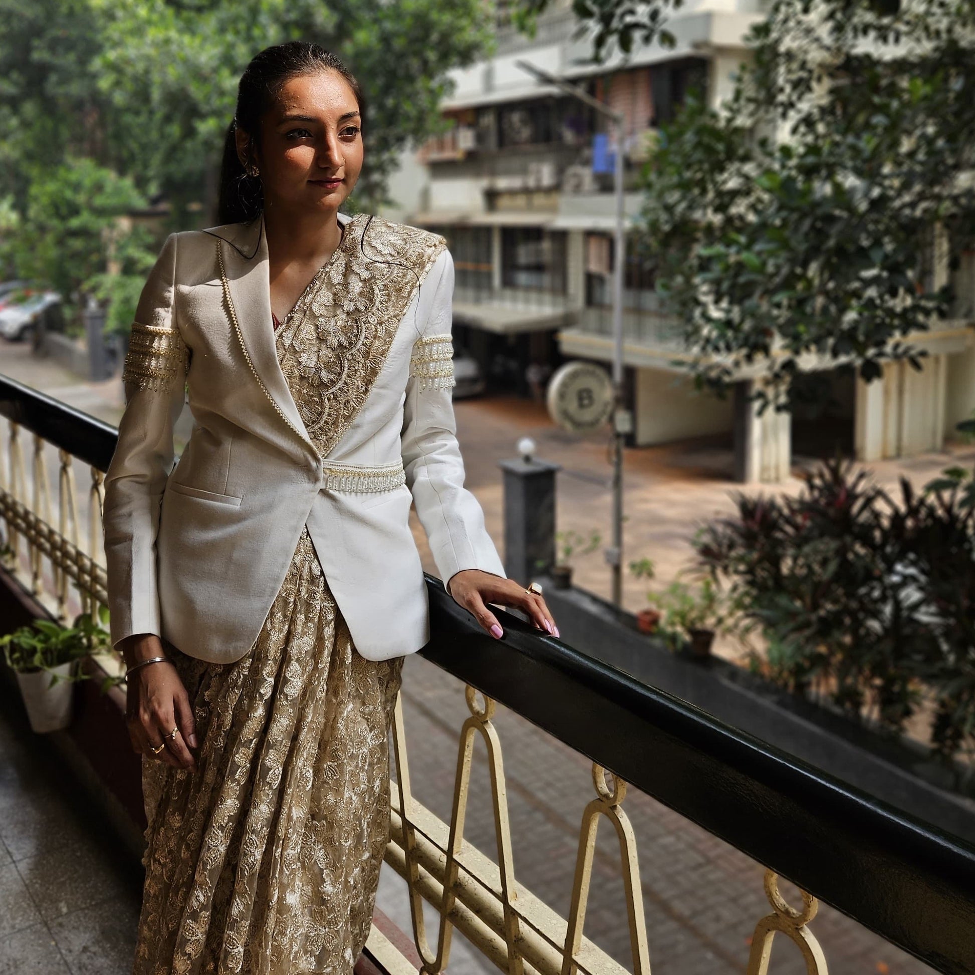 A chanderi silk blazer fusion for women who love experimenting, this blazer gives a bold, traditional and authentic look