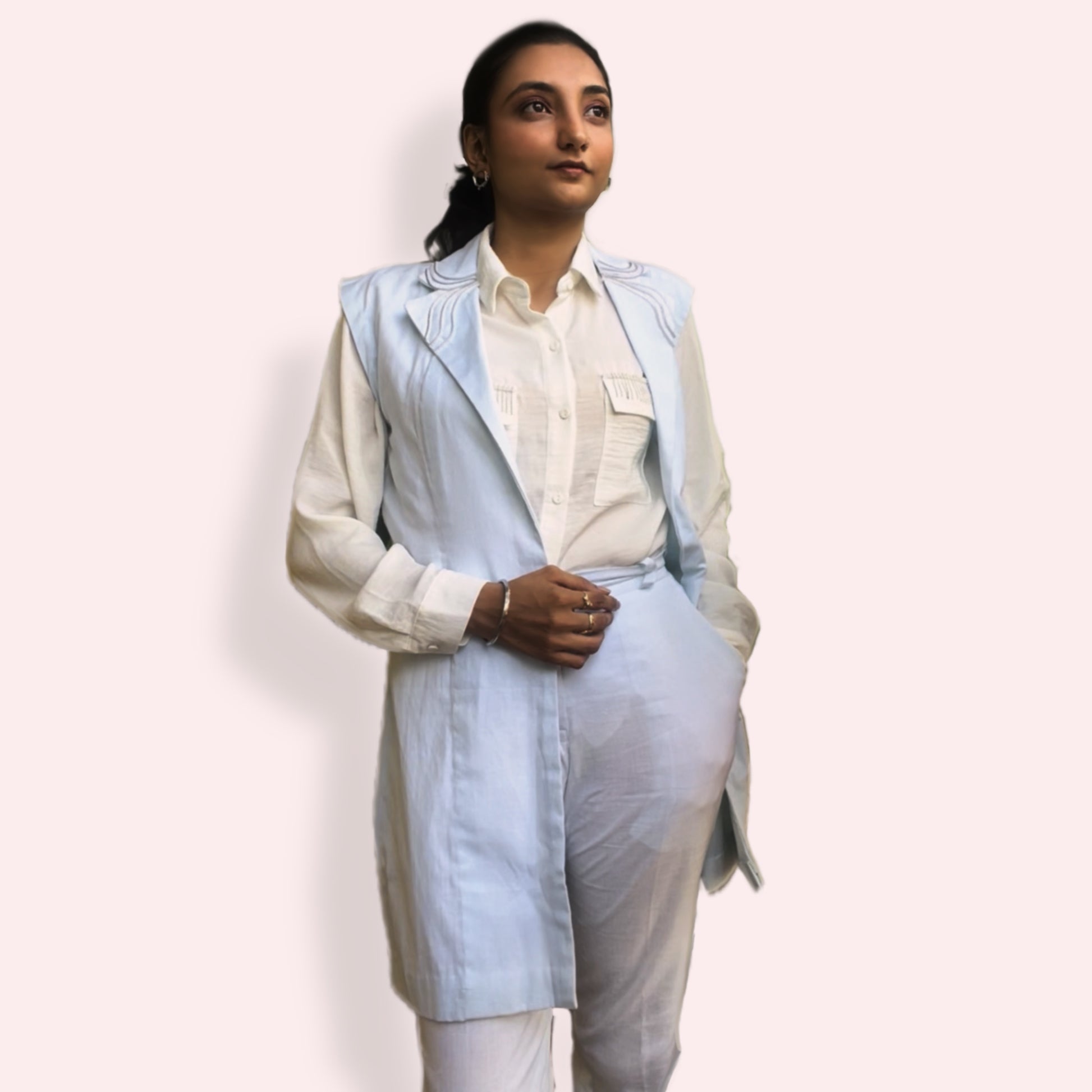 Classic jacket is a cotton jacket embellished with recycled zipper waste it is a sleeve less long jacket for formal or informal office look