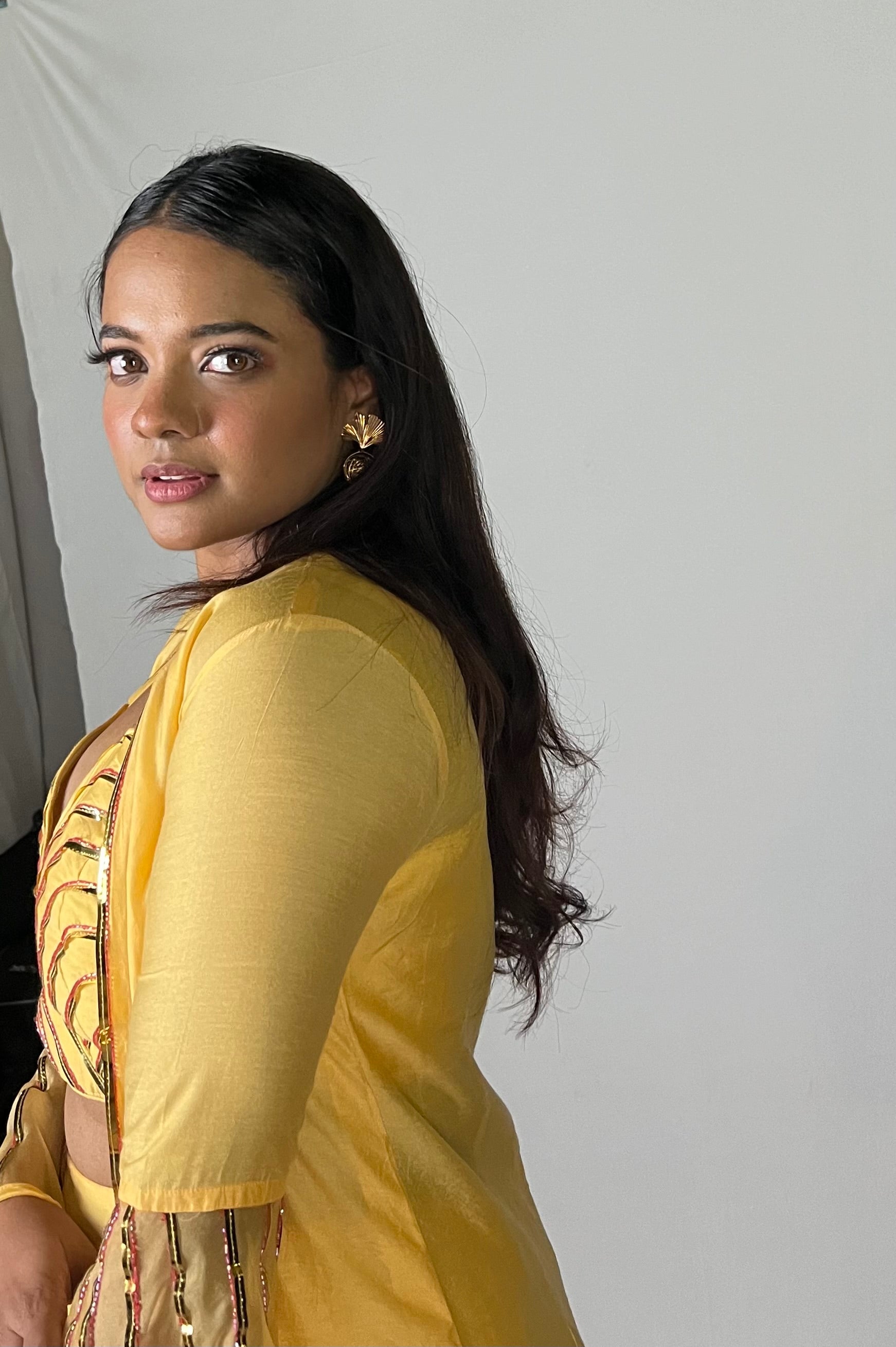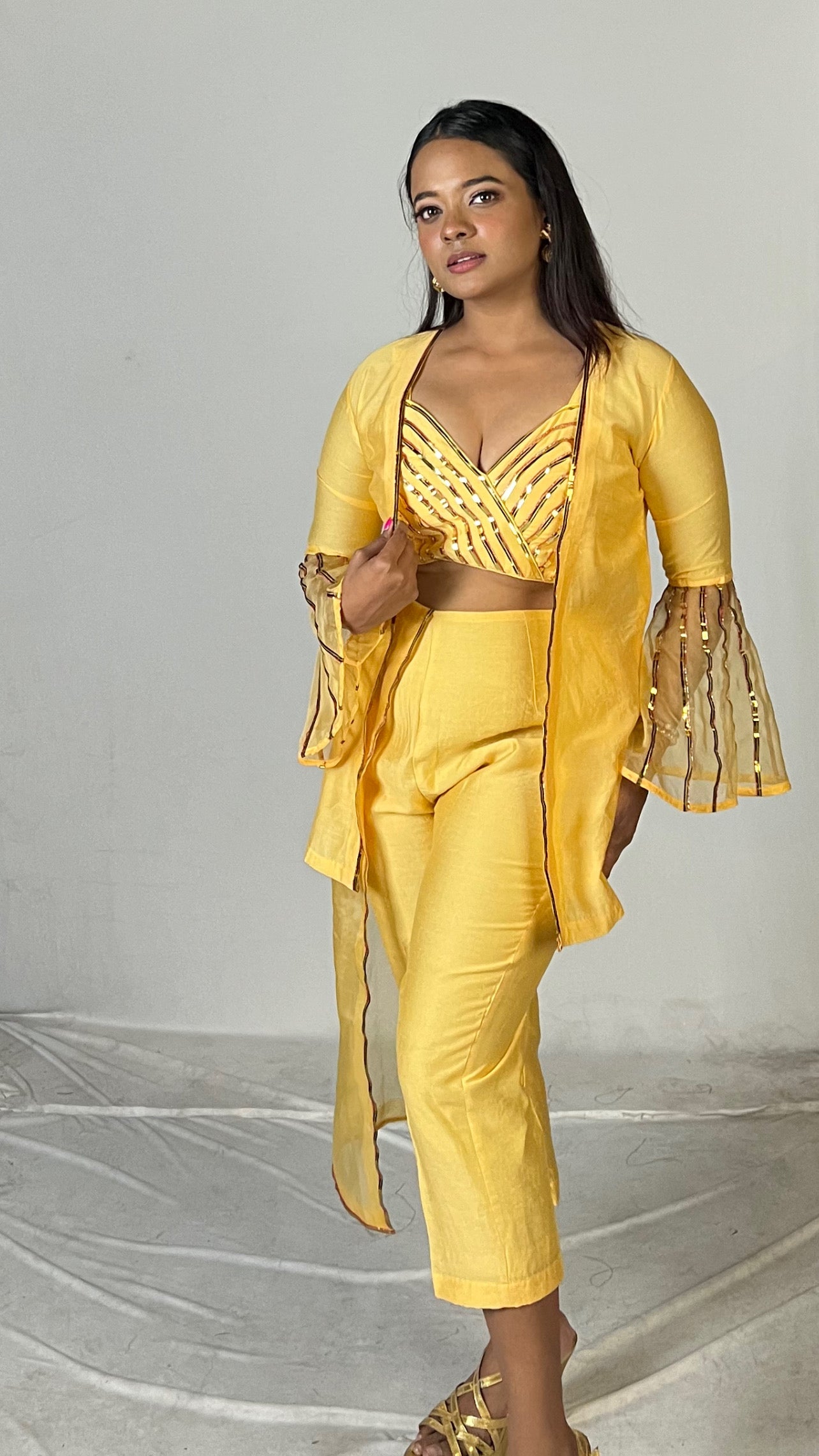 Tada tadi is an indo western outfit in Chanderi silk - a three price set includes a hand embroidered blouse, a jacket and bottom from our Pataka collection can be worn occasionally in a wedding party,sangeet,haldi,etc
